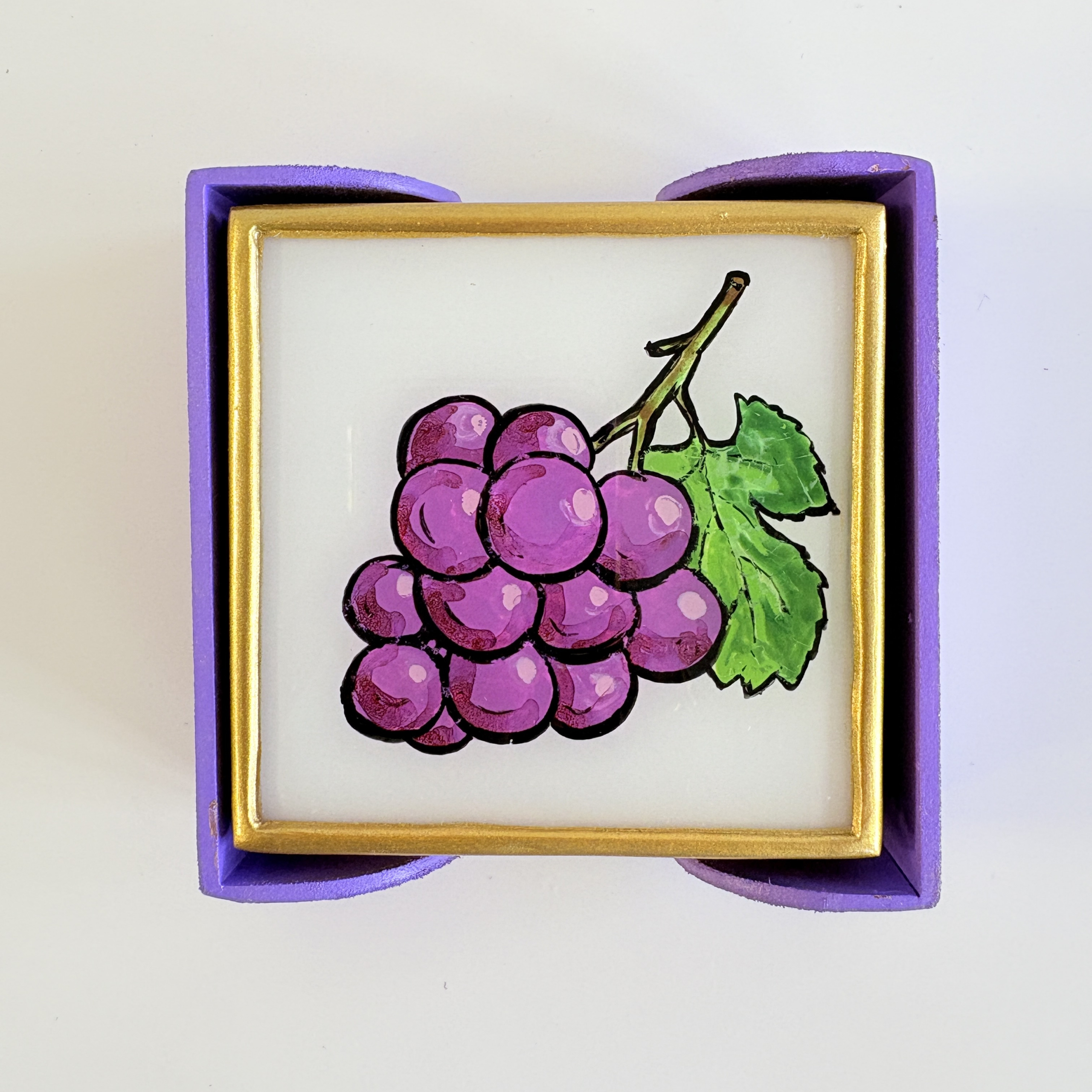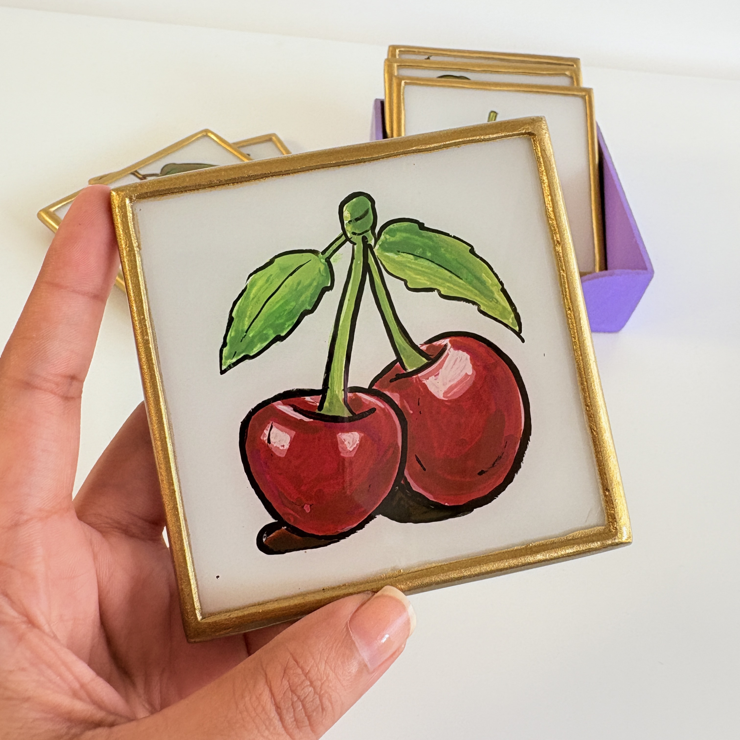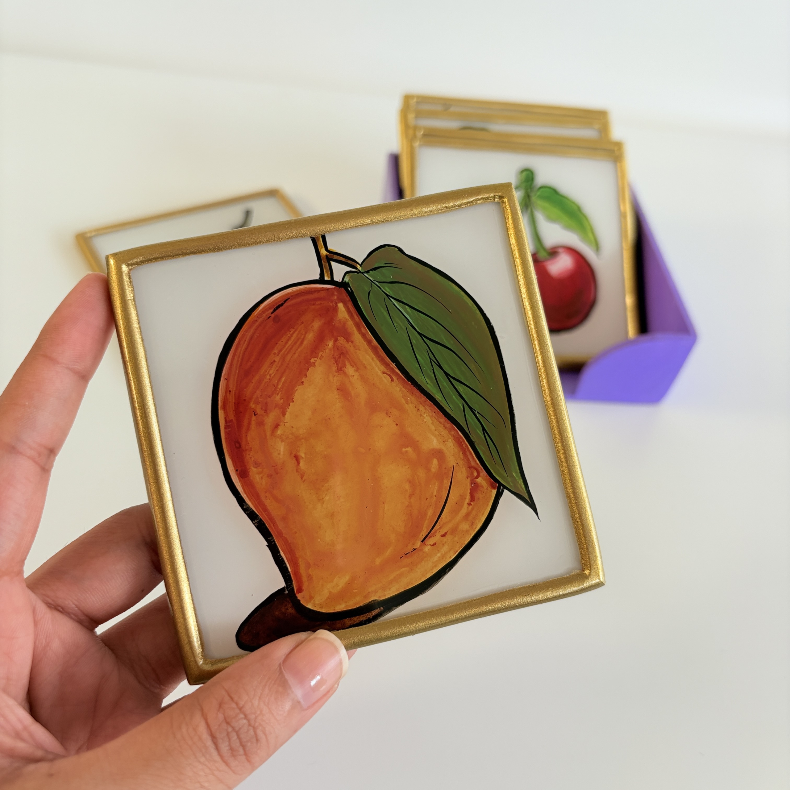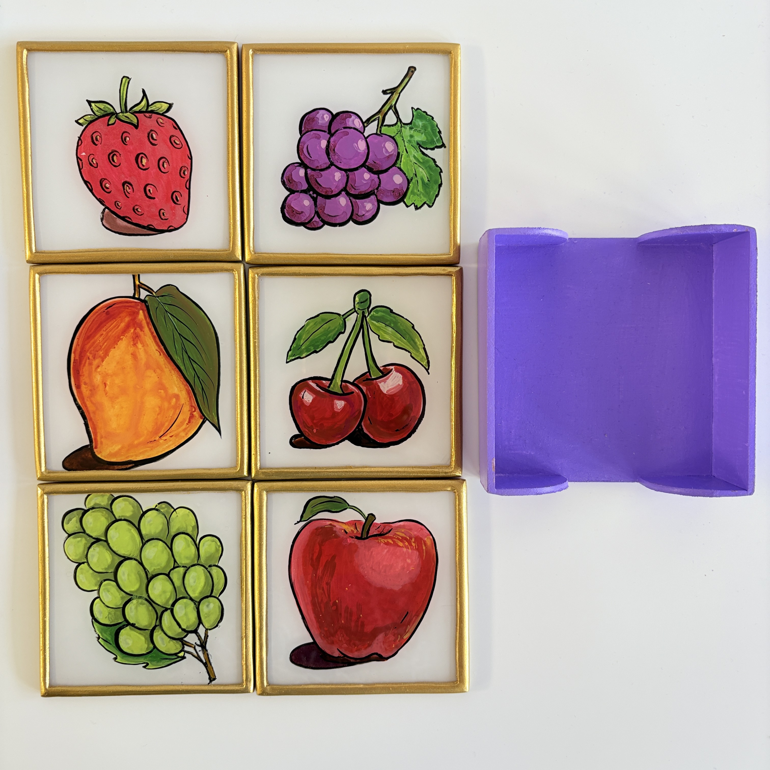 Handmade Fruits Theme Glass Tea Coasters set of 06 with Colourful Holder